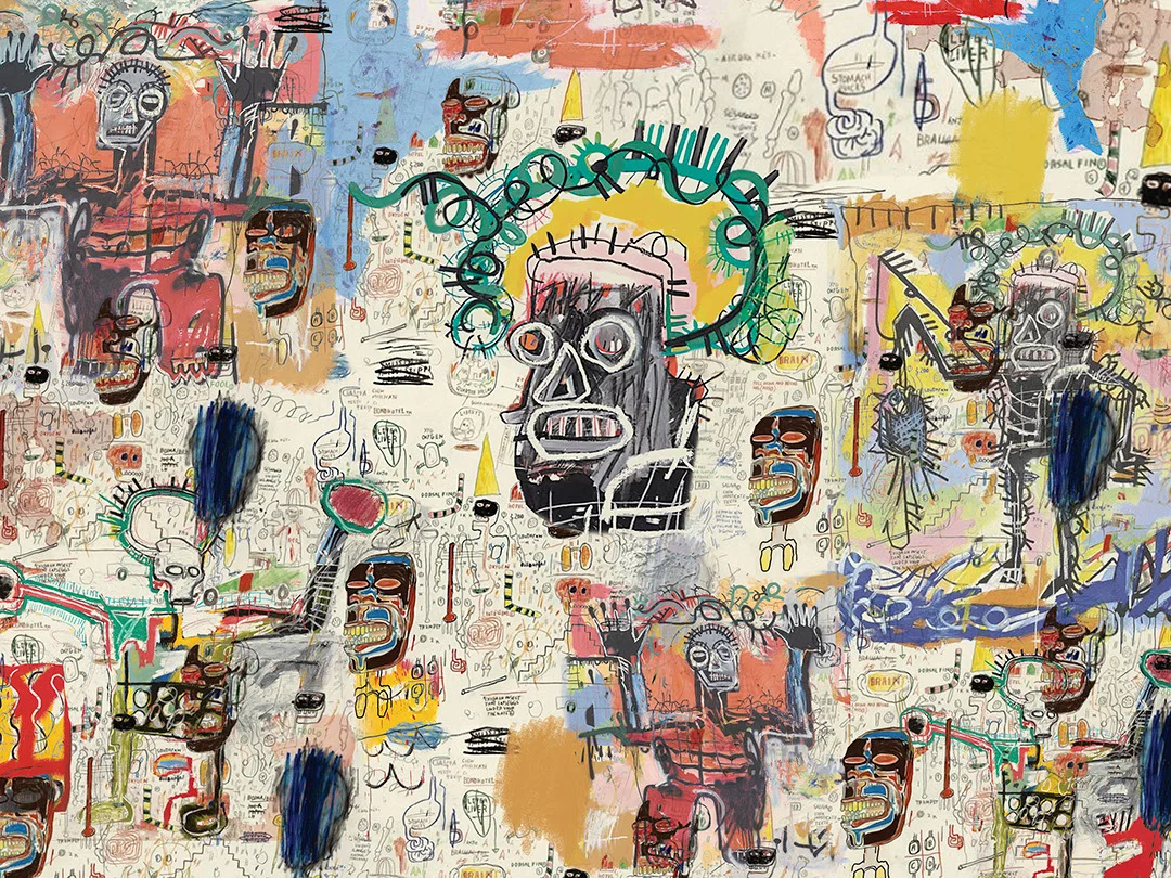 Art wall mural for the living room with beige Basquiat inspired graffiti faces