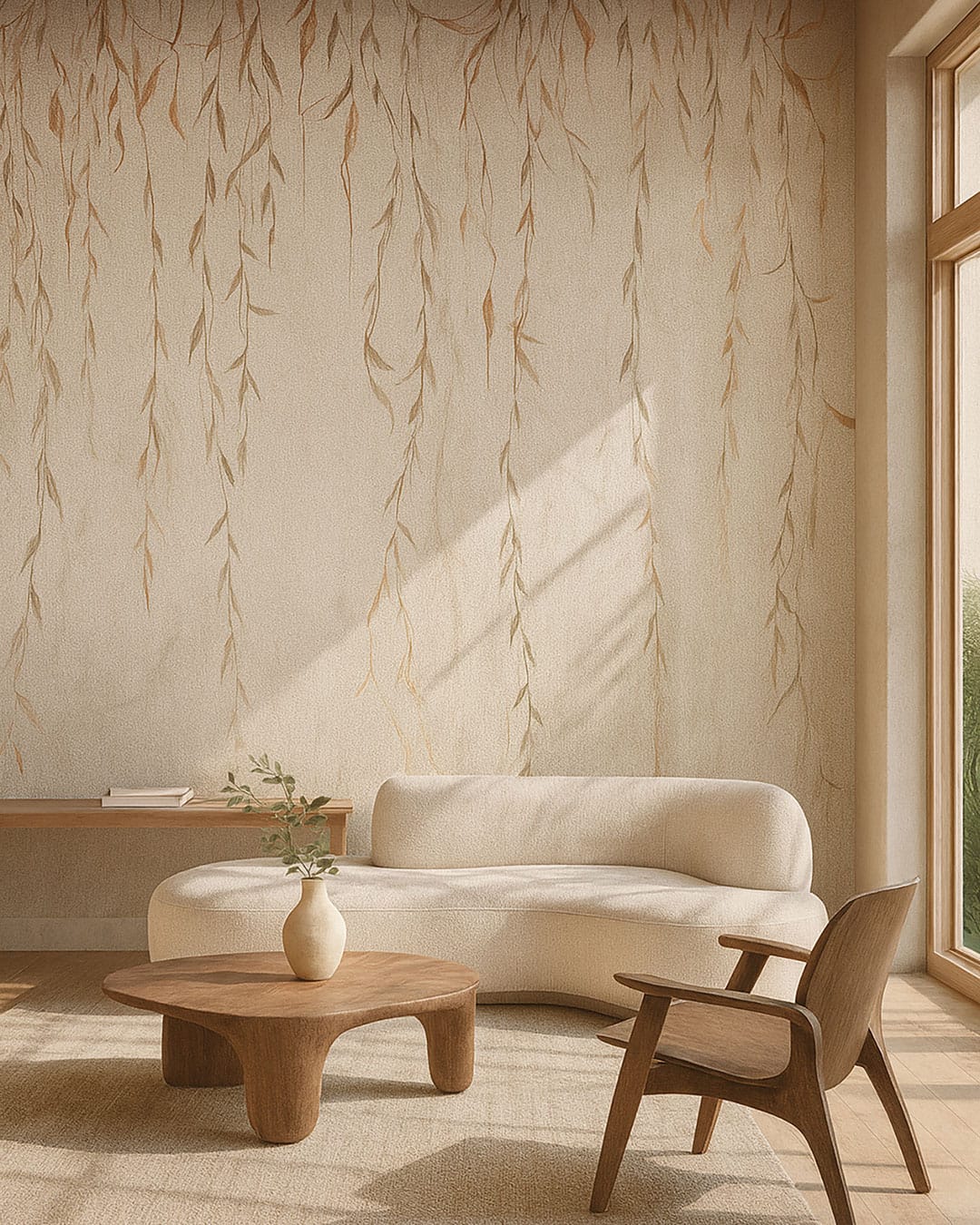Lynora introduces a sense of lightness with its graceful weeping branches drawn in soft natural tones. The gentle flow of the motif suggests calm movement, making this mural perfect for bedrooms, relaxation corners or bright, airy living rooms. Lynora pairs beautifully with linen textiles, pale wood and simple rounded furniture silhouettes. It suits interiors in wabi-sabi or Scandinavian style where quietness and authenticity are important. The design refreshes the space while staying subtle and refined.