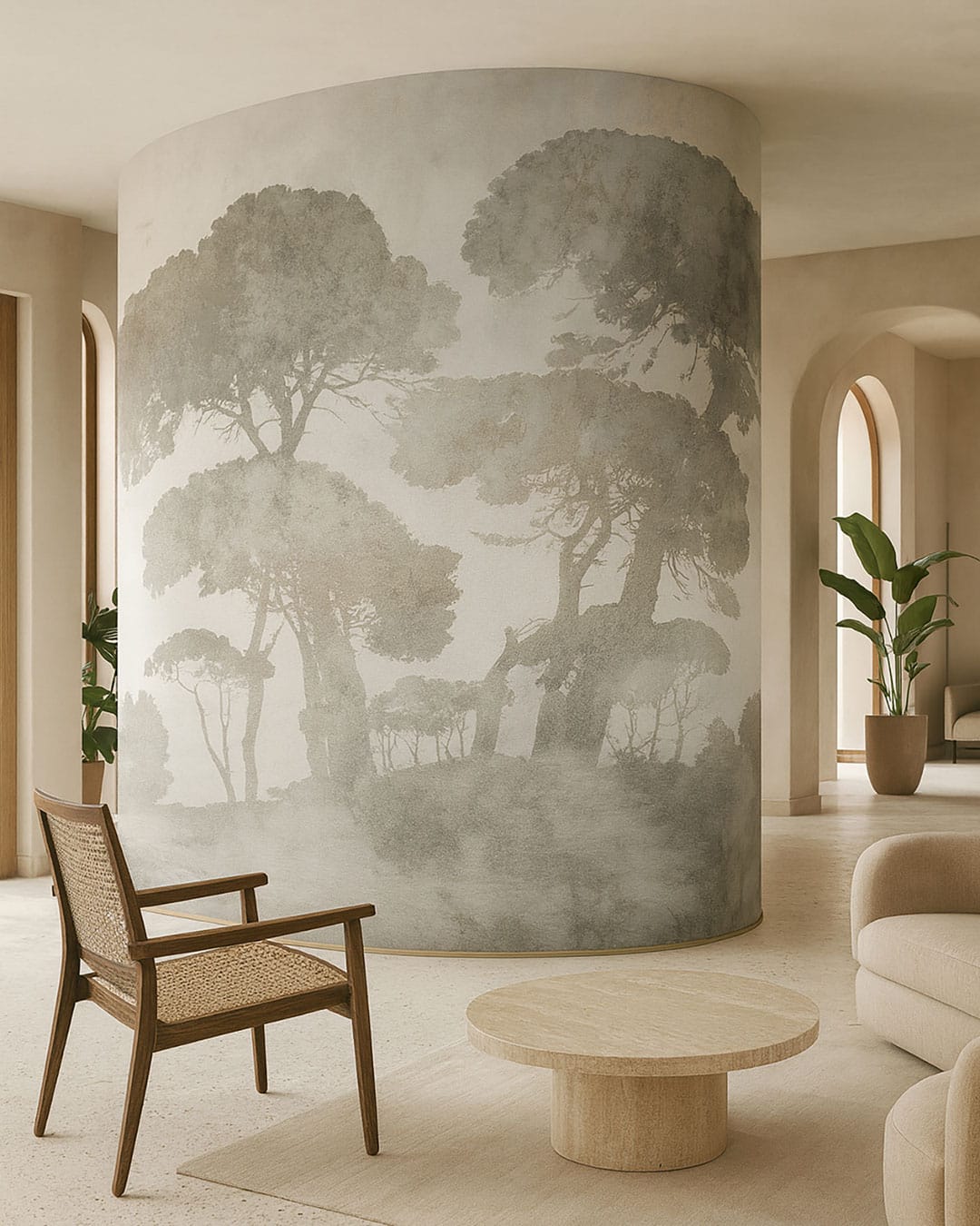 Aeris introduces a meditative calm with its pines fading gently into a soft grey mist. The cool palette adds depth and airiness, making the interior feel open and uncluttered. This mural is ideal for modern bedrooms, focused workspaces or minimalist living rooms. Aeris pairs naturally with glass accents, light wood furniture and linen textiles. It helps to create a serene contemporary environment that invites quiet reflection.