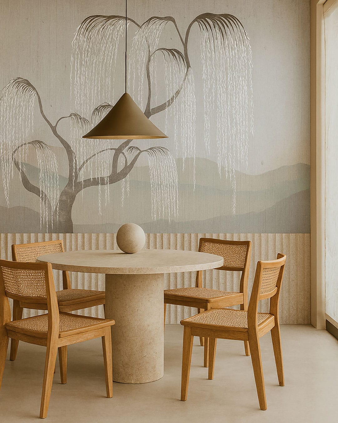 Willora captures the quiet elegance of willow branches cascading gently across a layered mist-like background. The monochrome palette and flowing forms create a meditative calm that softens the entire space. This design is perfect for minimalist interiors, Asian-inspired modern rooms or contemporary homes seeking a serene, airy mood. It pairs beautifully with natural wood finishes, light textiles and warm diffused lighting. Willora is an excellent choice for bedrooms, relaxation corners or peaceful home offices.
