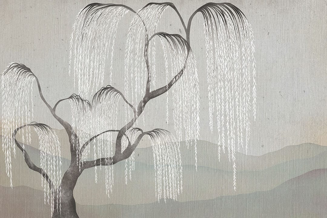 Wall mural stylized willow with cascading pale branches over a soft misty backdrop