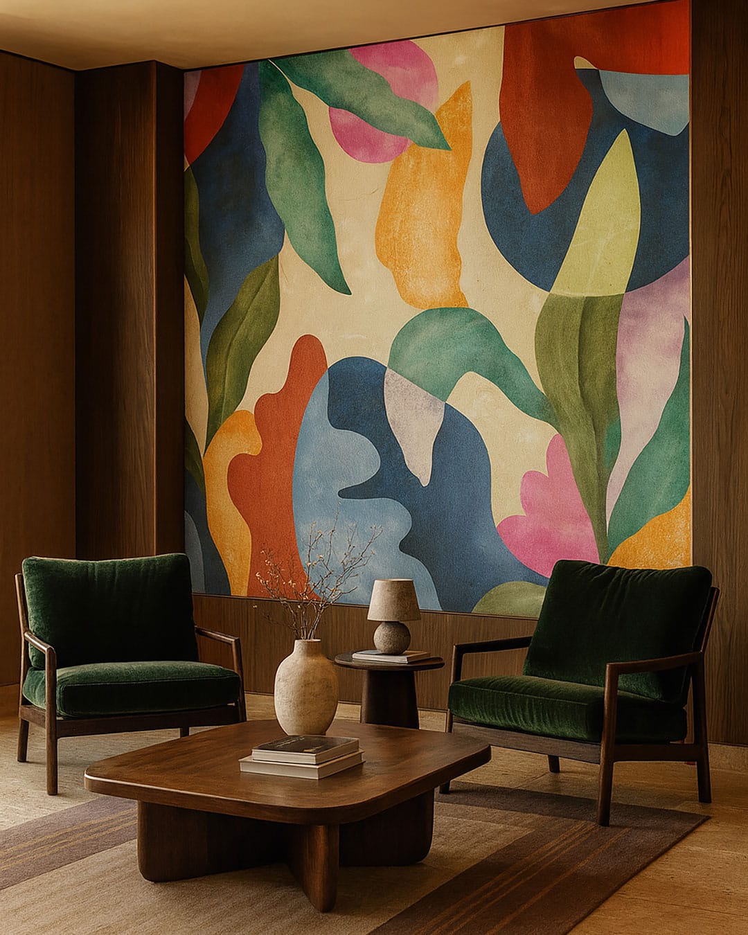 Chromis delivers a layered interplay of deep abstract shapes in tones of blue, indigo and muted olive green. The composition feels immersive and expressive, creating a space that is both bold and intimate. It works beautifully in contemporary interiors, loft settings and minimalist rooms seeking a strong artistic anchor. Pair Chromis with dark wood, matte metal finishes and neutral textiles. Ideal for a living room, creative studio or a refined office environment.