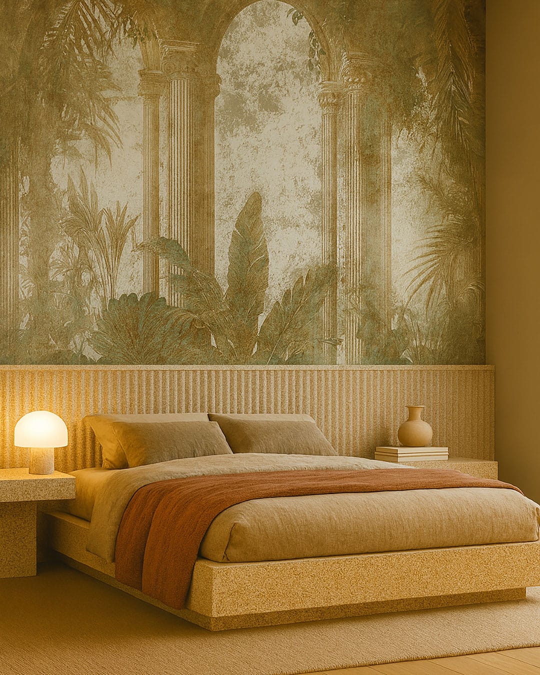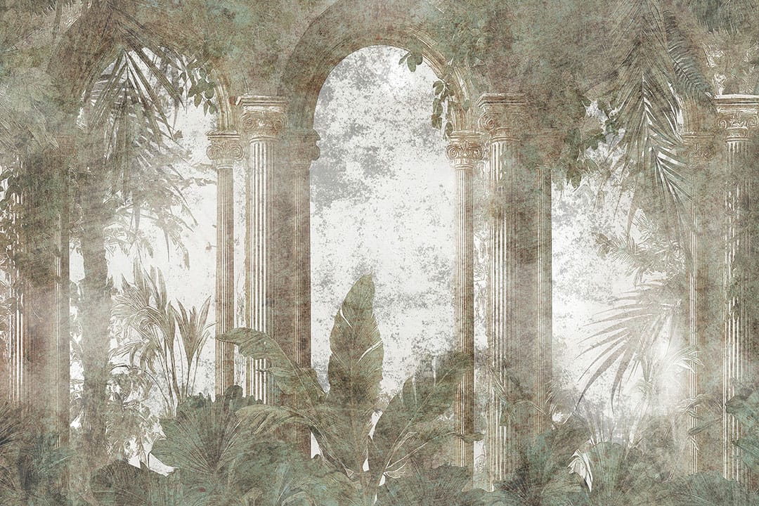Arcadia suggests the calm of an ancient garden ruin where old columns disappear into greenery and a soft patina of time. The muted moss-and-sand palette creates a gentle backdrop that adds depth without darkening the room. This mural is perfect for living rooms, bedrooms, wine rooms or boutique hotel suites seeking an atmosphere of escape. Arcadia pairs beautifully with natural wood furniture, rattan details, ceramics and textiles in olive, beige and warm grey tones. In generous spaces it can become a dramatic feature wall, while in smaller rooms it wraps the interior in a soft, immersive panorama. The design expresses a love of nature and history with a refined, weathered character.