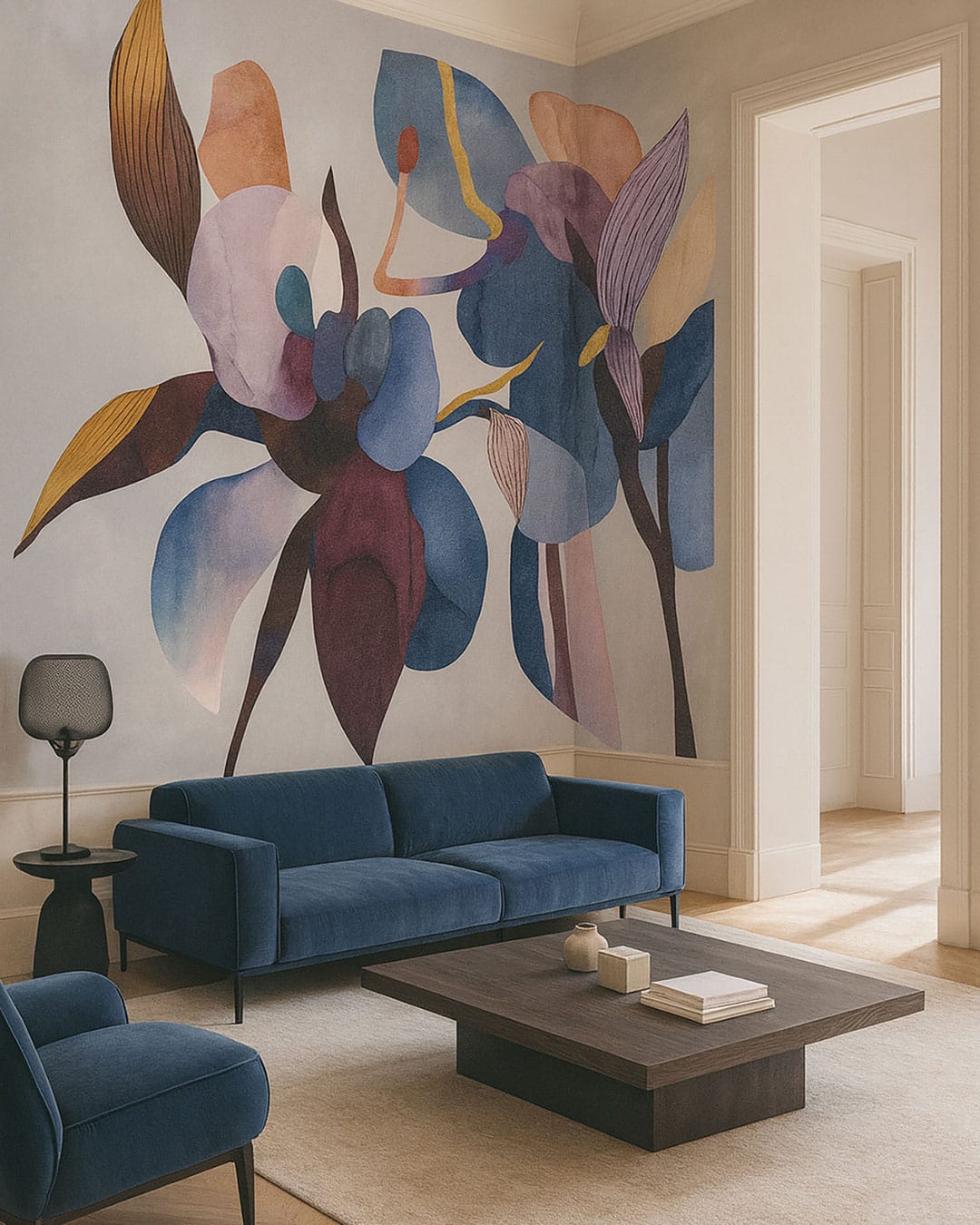 Florena captures the delicacy of watercolor strokes forming abstract floral shapes in a soft pastel palette. The mural brings lightness and refined airiness to the room. It is perfect for bedrooms, children’s rooms and bright living spaces. Soft hues make the interior soothing and harmonious. Florena pairs beautifully with natural textures and light-wood furniture. Under gentle lighting, the floral forms gain additional depth. It is an excellent choice for interiors seeking a poetic, graceful atmosphere.
