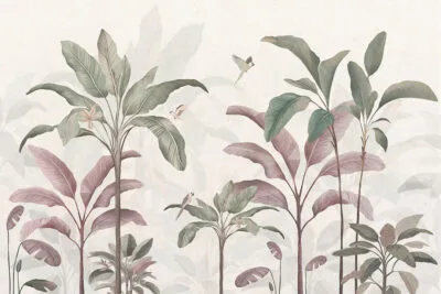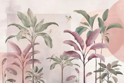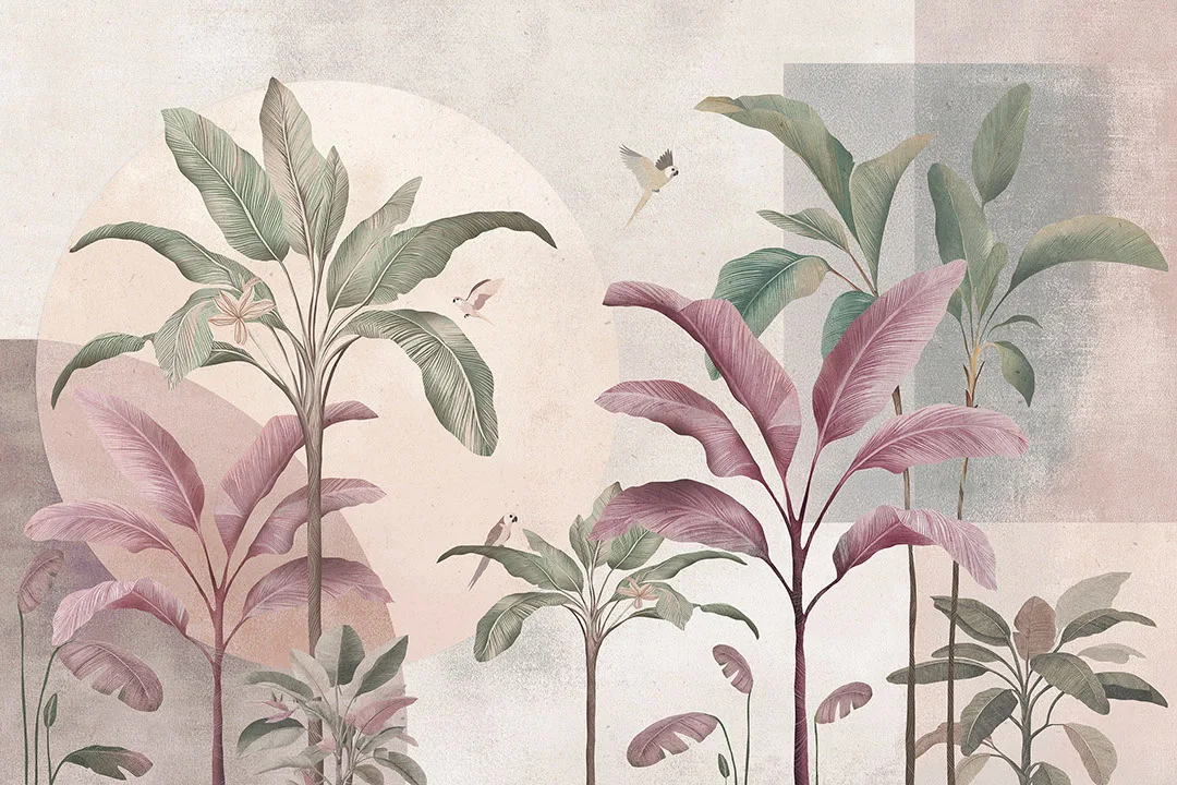Palmaris brings a sense of gentle tropical calm through its pastel foliage and small birds. The mural adds freshness and softness, making the room feel brighter and more peaceful. It is perfect for bedrooms, children’s rooms and living spaces seeking a natural, airy aesthetic. Warm pink and green hues create a harmonious composition. Palmaris pairs beautifully with light wood, rattan and natural-toned textiles. Soft lighting enhances the depth of the leaves and the delicacy of the illustration. It is an ideal choice for interiors aiming for a gentle botanical mood.