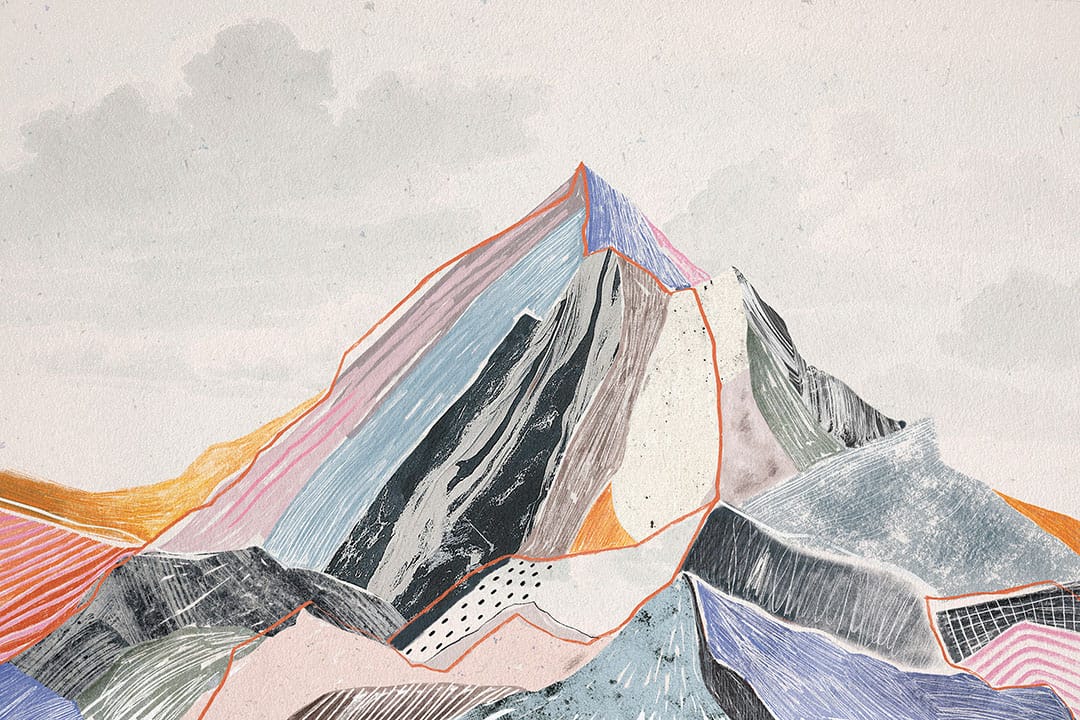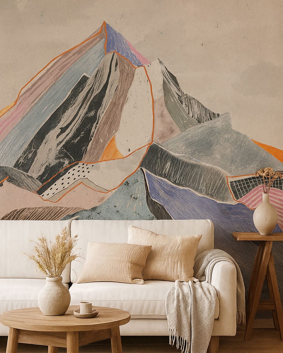 The Montela wall mural depicts a mountain peak built from coloured planes, strokes and lines in shades of pink, blue, clay and soft grey. The drawing feels like a blend of watercolour and coloured pencil, creating a light, creative mood. This motif works beautifully in a child’s room, study or studio where you want to support a dreamy, inspiring atmosphere. The pastel palette keeps the space calm and pairs easily with light furniture, natural wood and simple woven textiles. In modern, Scandinavian or eclectic interiors, Montela adds a graphic focal point without feeling too sharp. In coworking spaces, creative offices or cafés, the mural subtly underlines ideas of reaching new peaks and exploring bold solutions. It is a gentle way to introduce a mountain theme into an urban interior.