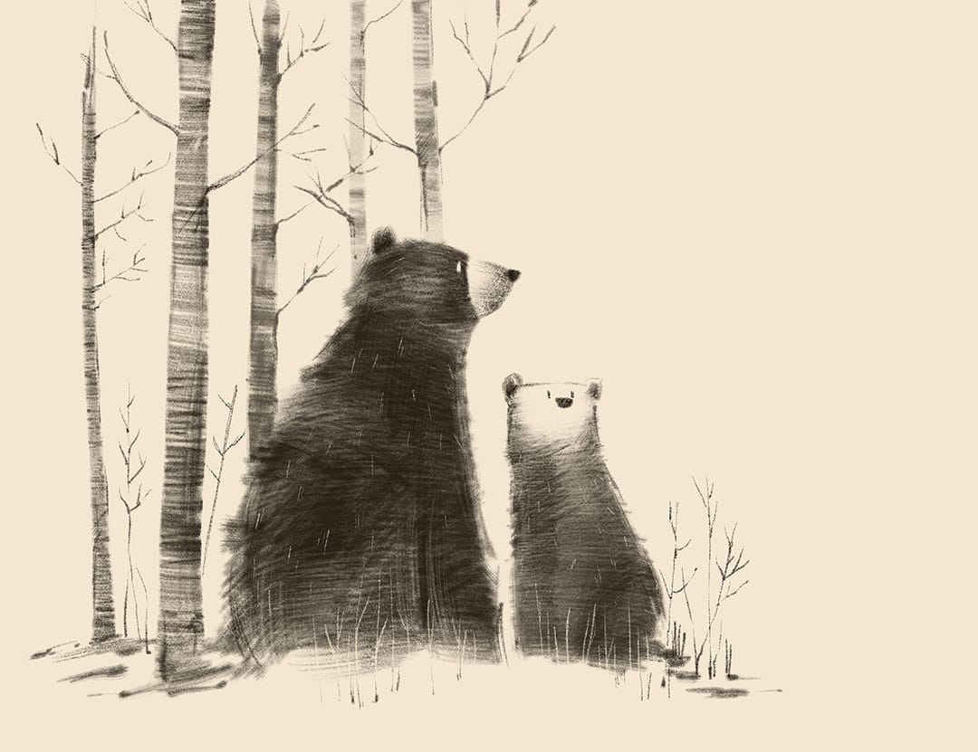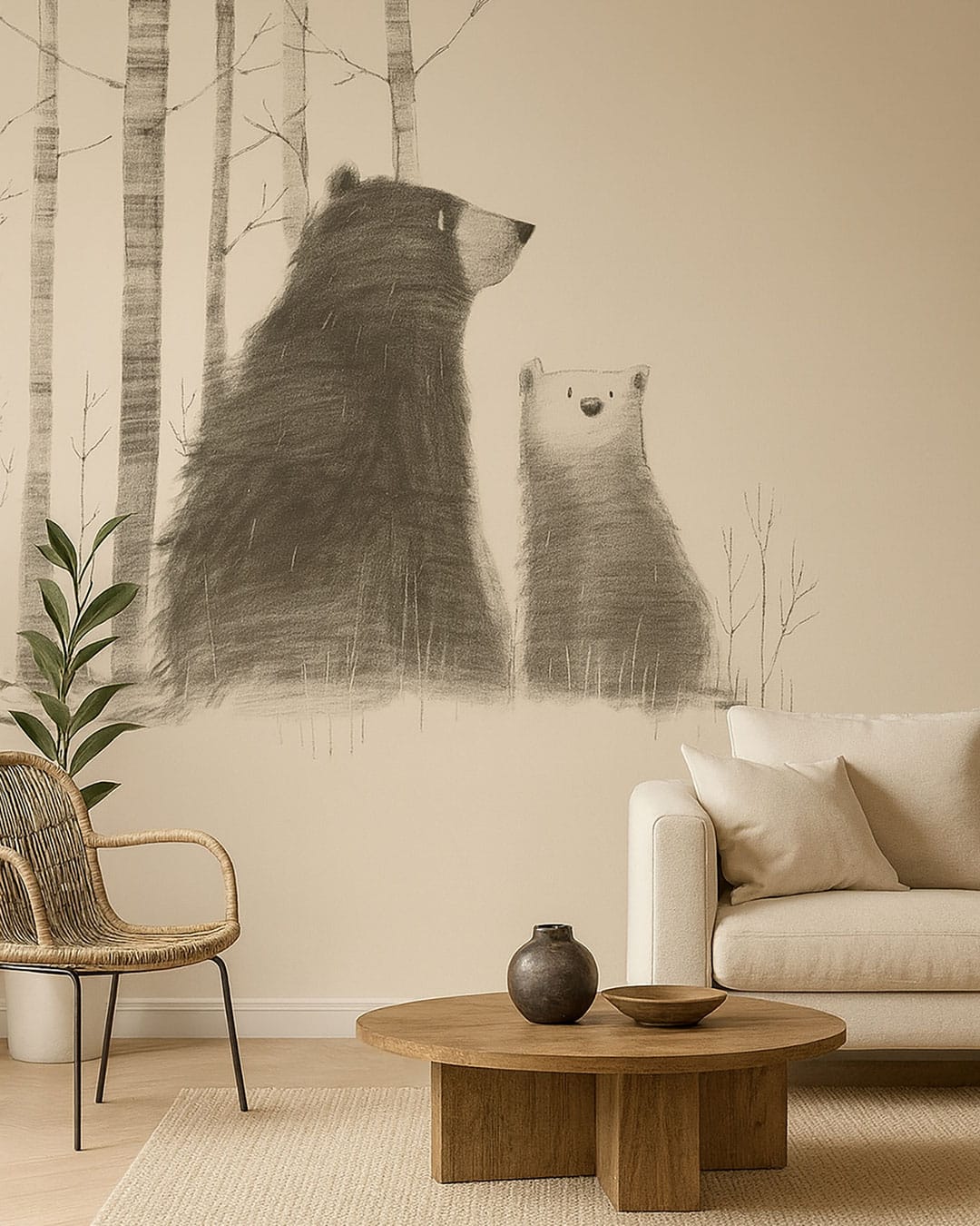 Ursina shows a large and a small bear sitting calmly among slender birch trees, telling a gentle story of care and trust. The soft monochrome drawing feels like a delicate pencil sketch and brings warmth and security into the room. The unobtrusive light background keeps the space airy and works well with many interior styles. This wall mural is ideal for kids’ rooms, nurseries, family reading corners or quiet lounge areas. Ursina pairs beautifully with wooden furniture, textiles in natural shades and forest-inspired accessories, creating a tender space for play, rest and bedtime stories.