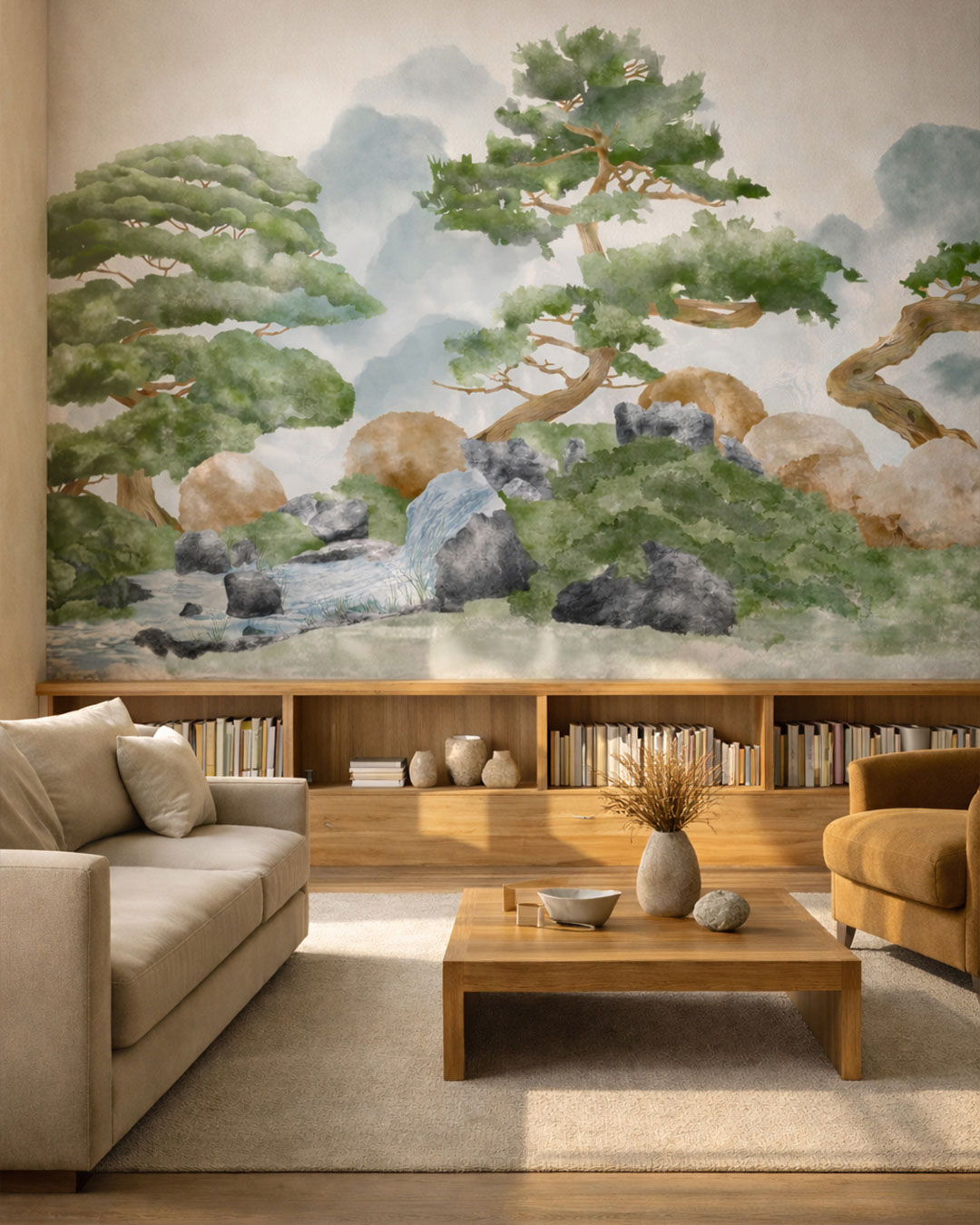 The Zenhara wall mural conveys a sense of calm and harmony through its delicate watercolor landscape. Graceful pines, rocky formations, and a gentle waterfall create a composition reminiscent of traditional Eastern gardens. Soft color transitions and semi-transparent textures add depth and lightness, enhancing the airy feel of the space. This mural is ideal for interiors focused on relaxation and balance, such as bedrooms, lounges, or wellness areas. Zenhara pairs beautifully with natural materials, light wood, and minimalist décor. It is a perfect choice for creating a peaceful, meditative atmosphere.