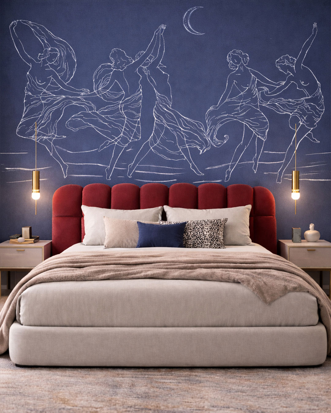 The Nocturne Dance wall mural captures a sense of movement, grace, and harmony through an elegant line-art composition inspired by classical art. The dancing figures are depicted in fluid, expressive poses that create rhythm and visual flow, as if the scene gently unfolds in motion. Fine, delicate lines emphasize the softness of the body and the natural elegance of movement, resulting in a refined and balanced composition. The minimalist approach leaves generous negative space, enhancing the feeling of calm, airiness, and visual clarity. A subtle textured background, reminiscent of paper or plaster, adds warmth and an artisanal quality to the design. The presence of the moon and light detailing introduces a poetic, nocturnal atmosphere that feels serene and contemplative. This mural is ideal for modern interiors, bedrooms, or creative spaces where elegance and lightness are essential. Nocturne Dance transforms the wall into a quiet, expressive artwork that blends rhythm, beauty, and timeless sophistication.