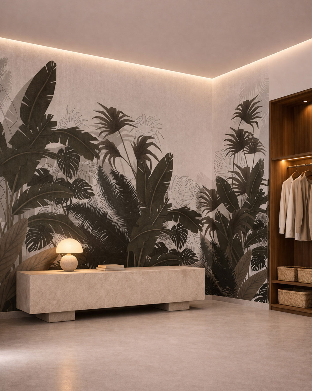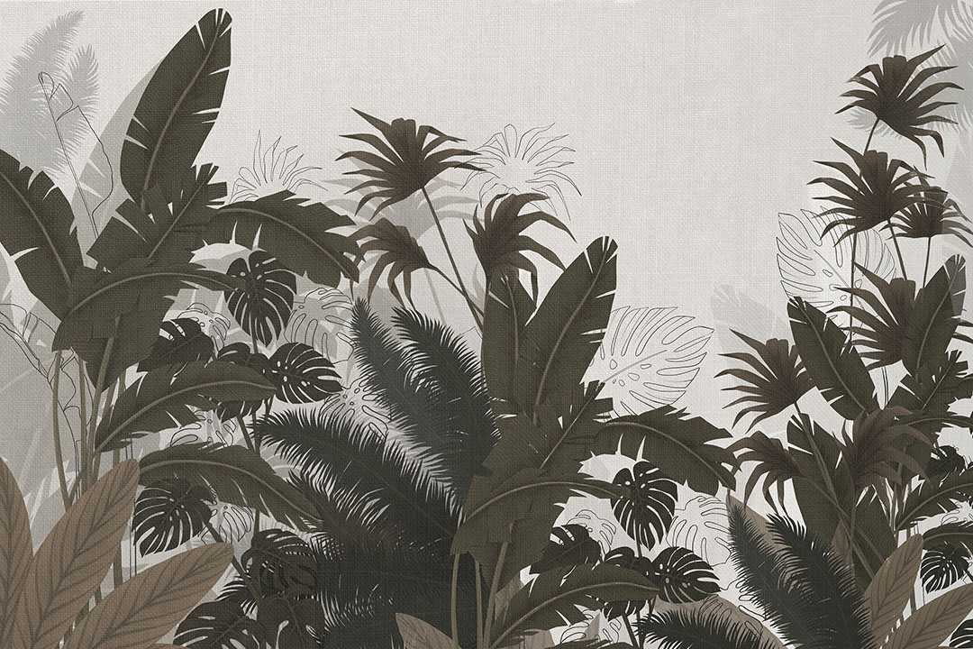 The Silvara wall mural presents tropical foliage in a refined monochrome palette with a layered composition. Multiple plant layers create a sense of depth and natural density. The foreground appears darker and more defined, adding contrast and structure. In the background, softer and lighter silhouettes enhance spatial perspective. This interplay of tones creates a calm and sophisticated visual effect. The light background highlights the organic shapes of the leaves. Subtle textures add a natural and tactile quality to the design. The overall composition feels balanced, elegant, and timeless. The absence of bright colors makes the mural versatile and easy to style. It is ideal for minimalist and contemporary interiors. It pairs beautifully with wood, stone, and soft textiles. Silvara brings calmness, depth, and understated natural elegance into the space.